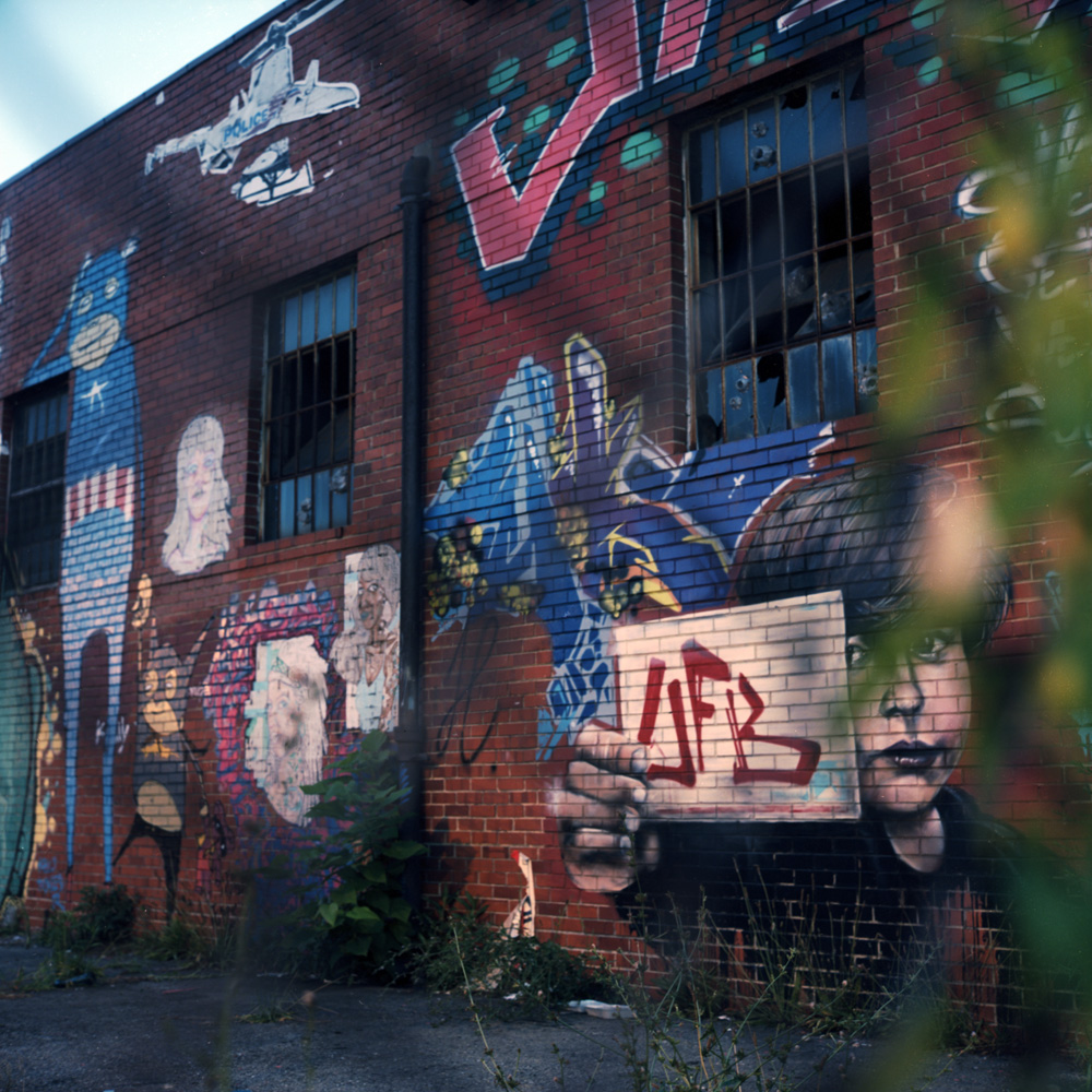 Around the corner from Nellies is this abandoned warehouse which has some really wild and cool and somewhat disturbing graffiti on it. I shot some of this graffiti through the chain link fence around the side lot. The disturbing piece I intentionally cropped out of the shot, as it is the nude lower half of a female body that appears to have been severed from its torso.