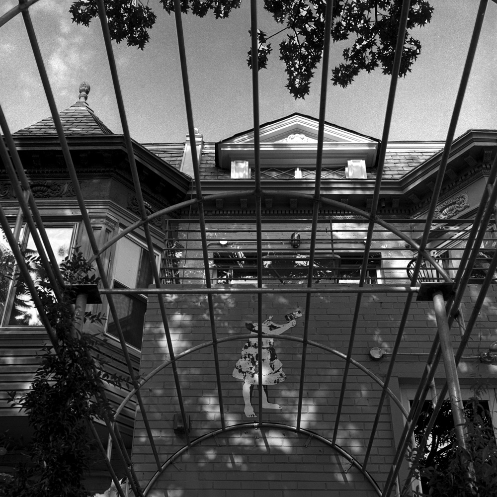 In contrast to the modern awning frame and handrail around the front patio, this 1910s/20s wrought iron hand rail frames the steps on the house next door to their building.