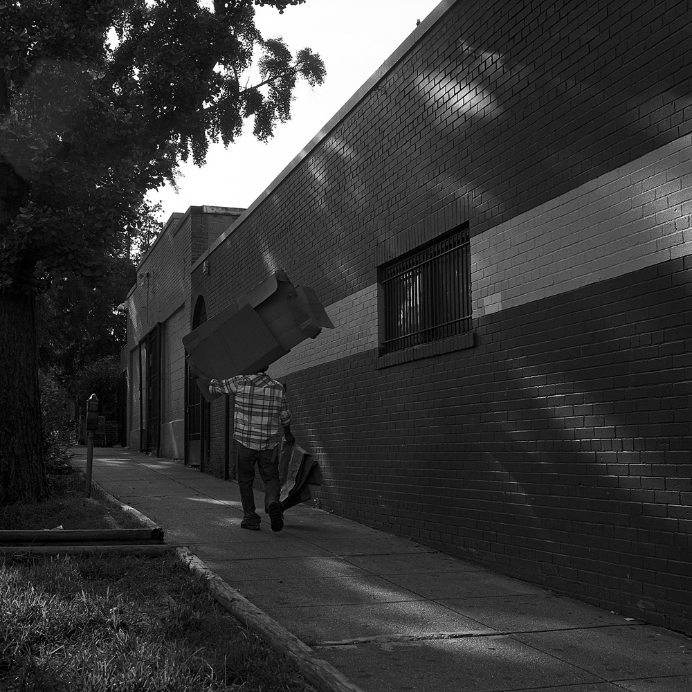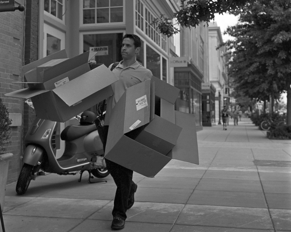 Pivoting to the left of the Pinch logo, I saw this lovely vanishing-point perspective of the building walls, dappled in evening sunlight. As I was composing the shot, this man hauling a gigantic cardboard box over his shoulder walked into the frame. Taking advantage of the serendipitous perspective-giving presence of the man, I waited until he was about 2/3 of the way in the frame before shooting.