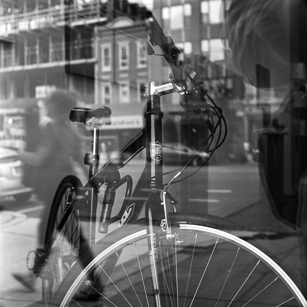 I happened upon this scene on my walk home from work the other day. I’ve developed a thing for photographing bikes and other means of transport, thanks to seeing the bikeshare stations all over and watching people riding them. I like the multiple layers happening in the scene with the contents of the gallery merging with the scene behind. The bike is still the main emphasis, but you have the cars, the pedestrian, the interior volume of the gallery with art on the walls, and then the fractional self-portrait of me on the right side (mostly just camera bag in the reflection, but I’m still in the picture).