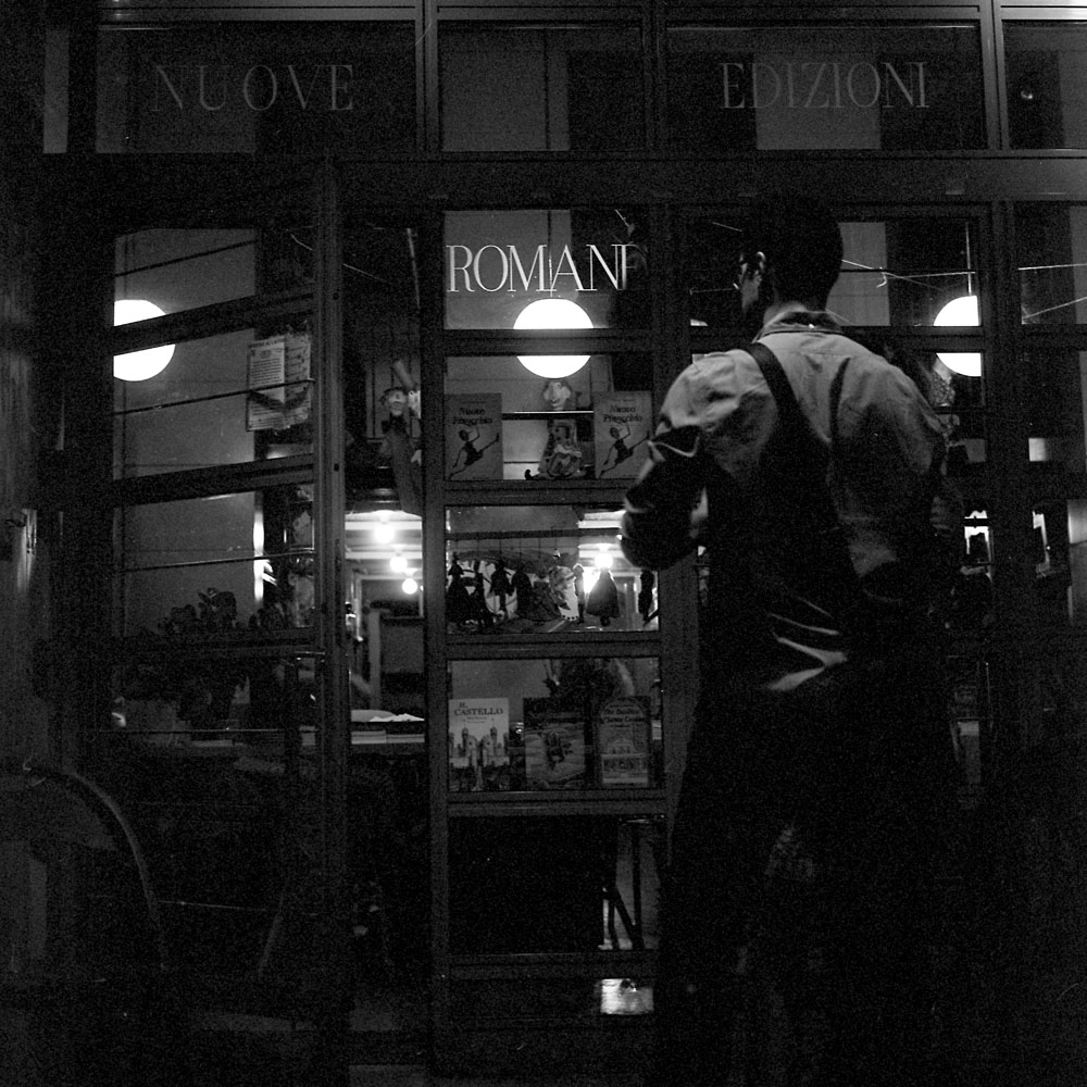 Here a late-opening book shop is perused by a customer as night envelops the neighborhood.