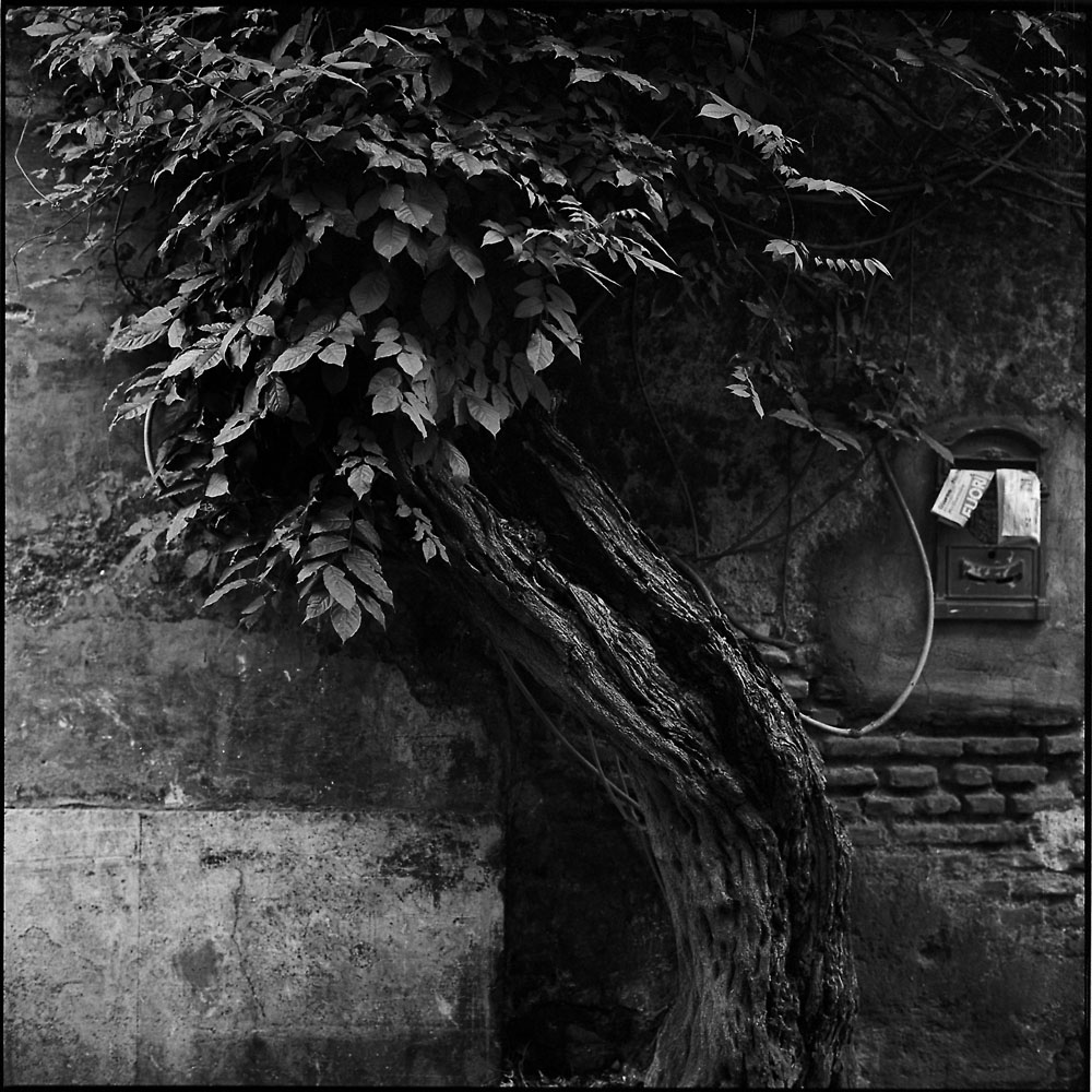 This flowering vine has been allowed to grow for possibly centuries until it has turned into a tree, swallowing the downspout and enveloping the wall, leaving room for the mailbox and its door just beyond.