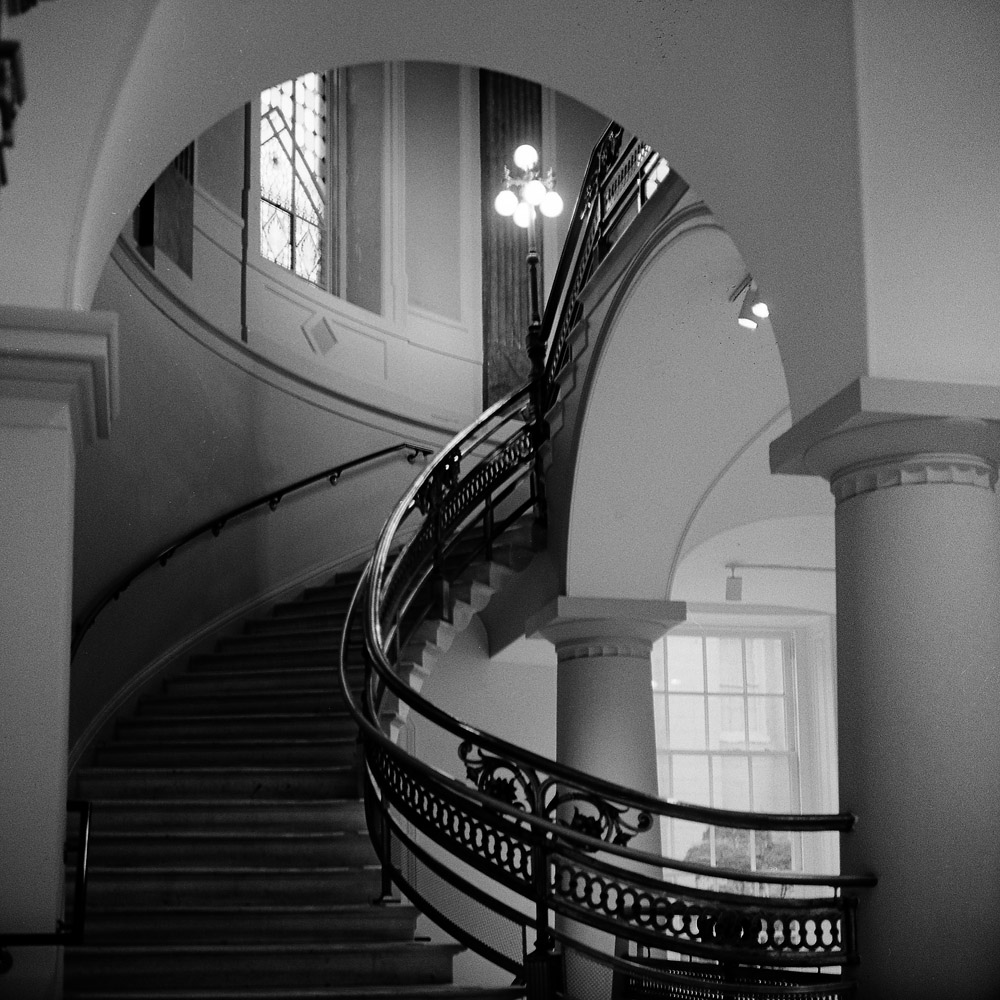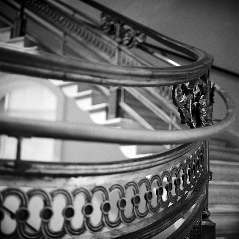It has several of the most exquisite and dramatic staircases in the city, in my opinion. The following photos are of the main stairs that run from the F Street entrance up to the grand gallery on the third and fourth floors. There is another staircase that I can’t do justice to with the Rollei because it requires a wide-angle lens to show the sweep of the bannister and the giant mural of General Grant and his generals that spans the curved wall behind the stairs.