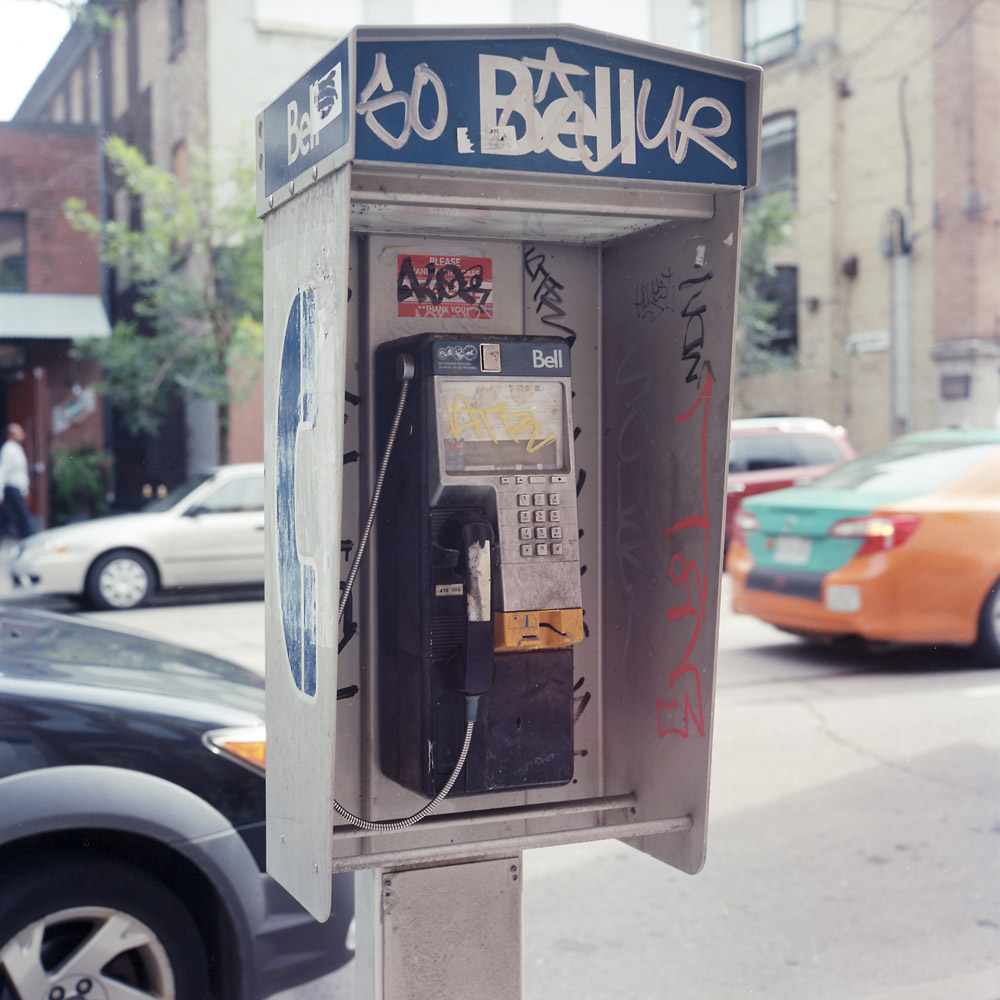 Another pay phone shot, showing the much-abused state of the poor neglected utility. I see a lot more pay phones around Toronto, but still not many people using them.