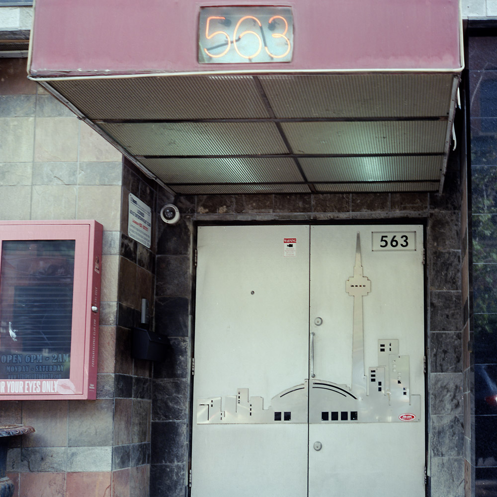 And over on King Street again, we have the For Your Eyes Only “Gentlemen’s” club, aka titty bar. At least they’re showing their civic pride with the skyline emblazoned on their front doors in steel cutouts.