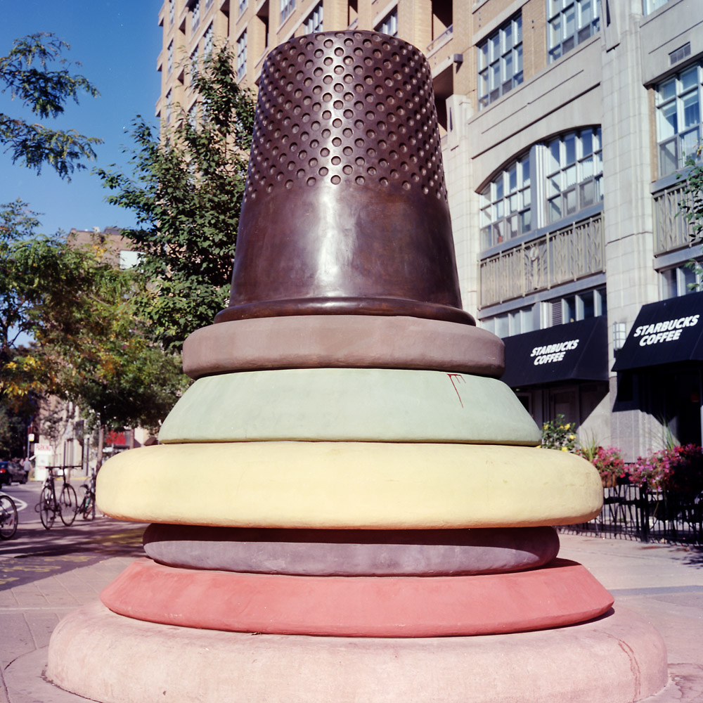 Across the street from the watchful gaze of the Cardboard Kirk, stands this sculpture. The first time I saw it, back in June, I thought it was an ice cream cone that had been dropped on its head. This time, I saw the tape measure embedded in the sidewalk and the signs proclaiming the area “Toronto’s Fashion District”, and I realized it is a thimble. But I still think whatever it’s sitting on looks nothing like anything relating to fashion, sewing, fabric, or otherwise so much as a stack of smashed ice cream scoops. Or maybe weird Italian cookies.