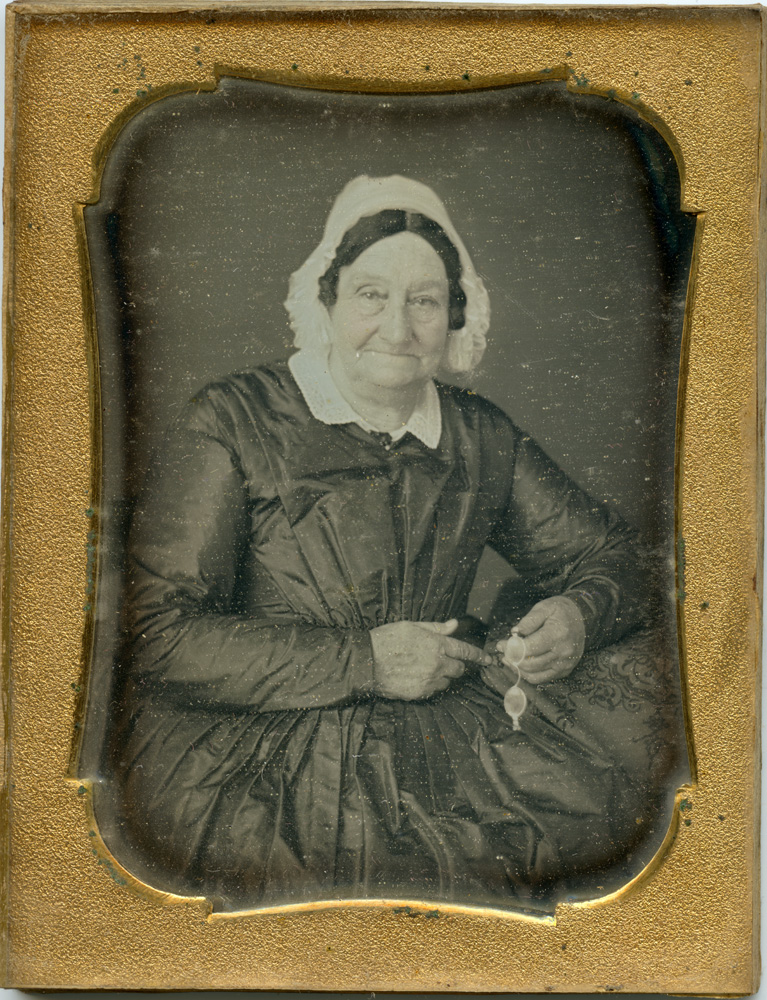 Another recent auction acquisition. This is a minuscule 1/9th plate (roughly 2 inches x 2 1/2 inches) Daguerreotype of two brothers. I bought this one because of the relatively unusual size (1/9th plate and smaller Dags are less common) and the subject – I’m not used to seeing 1/9th plate images of more than one person. It has condition issues – while the case still has the original hinge intact, the bottom of one side is missing, as is the lining of the bottom of the image side. The interesting thing about it is that it reveals the case in this instance is made of a thin wood box covered with tooled leather. Some of these cases were made of essentially cardboard before being leather-wrapped. I did do a little bit of cleaning on this one, as the original seals, while present, were badly deteriorated and lots of dust had gotten inside the glass. There is still some kind of schmutz on the surface of the plate, and I do not yet know how to safely remove it, so I am holding off on that. I have digitally cleaned up the scan of the plate to show the potential, but left some of the blotches in the image to give an idea of what it looks like in its present state.