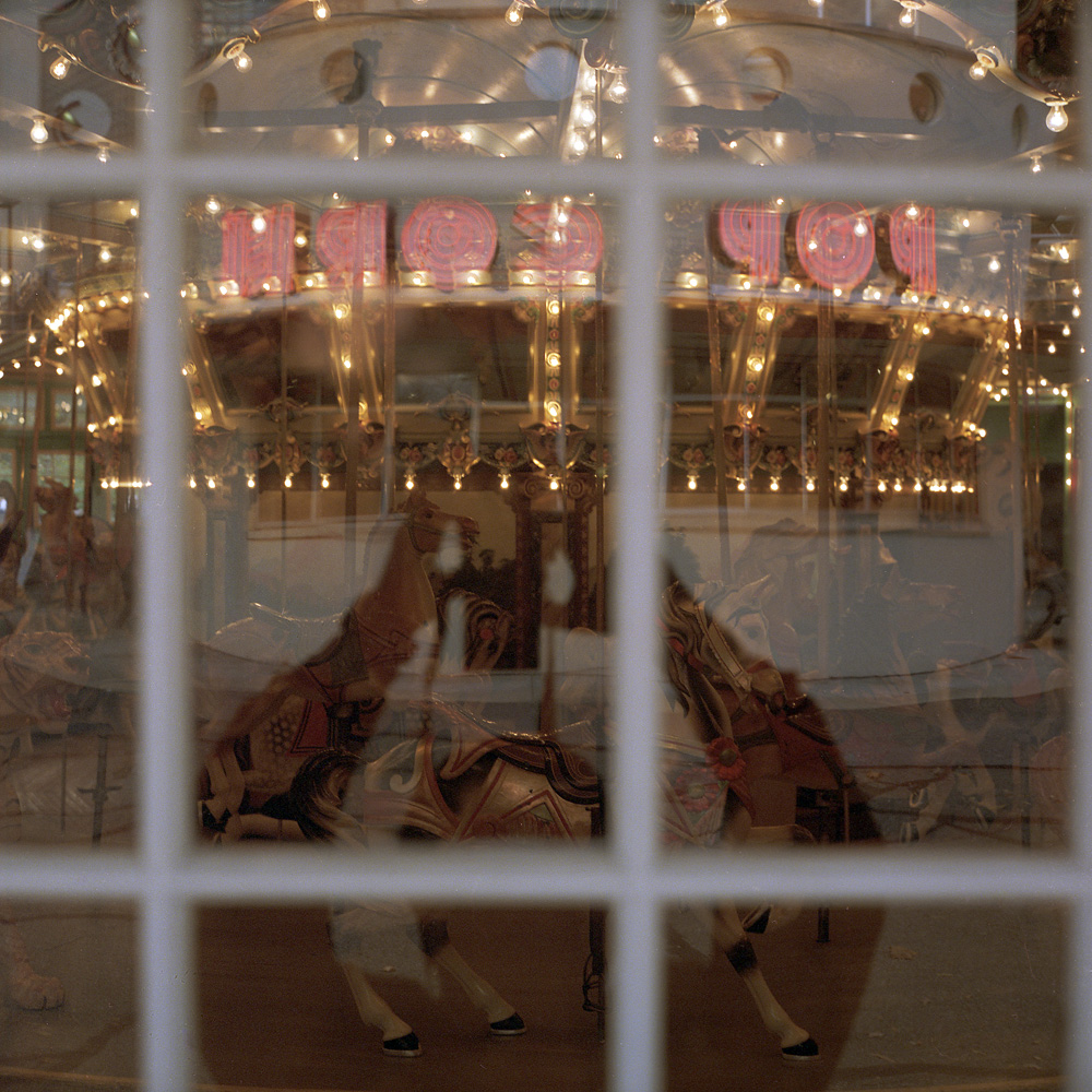 The neon of the arcade reflects in the windows of the carousel house, and I’ve caught myself taking the photo in the reflection as well. The reflected neon gives it a true carnival atmosphere – it almost feels like a real live amusement park, instead of the culture and arts center it has become. Which is not to say that the park lacks vibrancy and vitality, but it has a new character now, a lovable low-key quality that reflects and honors its past while preserving the facility for the future.
