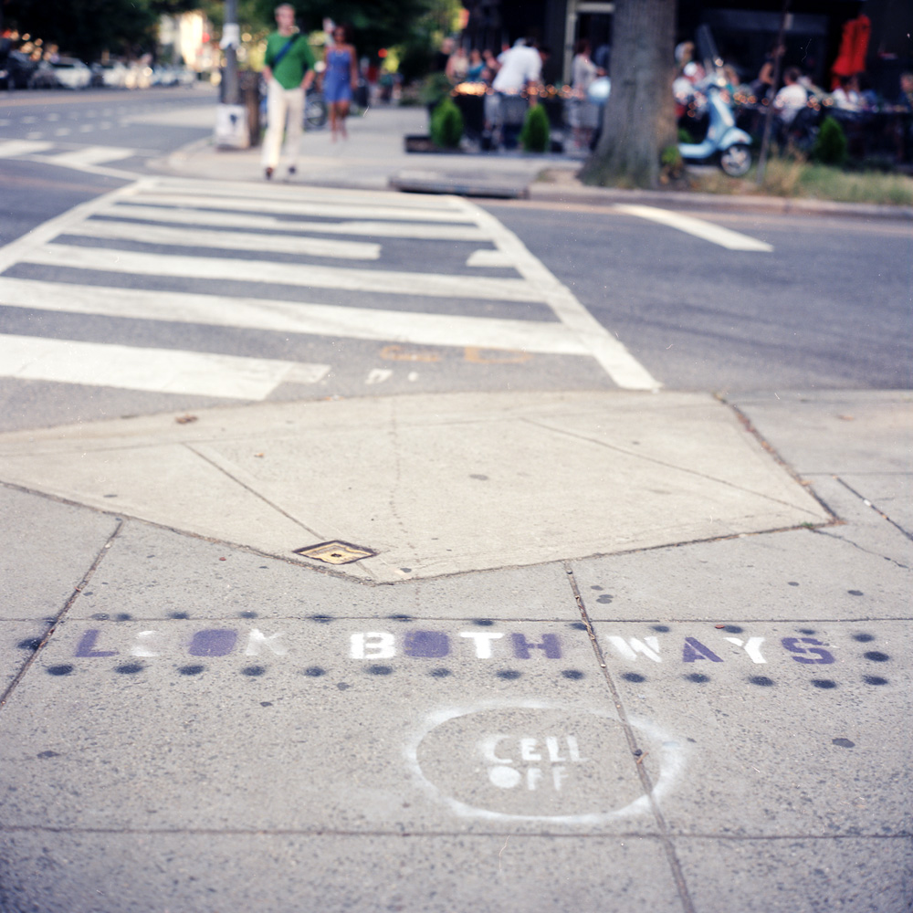 A sign of the times. General hipsterization plus the general trend of people being so absorbed by their mobile devices that they do stupid stuff like walk into traffic has inspired these signs spray-painted at the crosswalks of a number of intersections in the Upper 11th Trend Strip (don’t know what else to call it- North-East Columbia Heights Business District? NoECoHiBD? …that stretch of 11th where all the new restaurants have proliferated amidst old-time bodegas and coin laundries? How about just Hipster Velcro? (can’t call it a hipster magnet because that would imply something about hipsters that’s just not true. Velcro sounds about right because it sticks well to things like scruffy beards and ironic flannel). Of course, it NEEDS to be painted on the sidewalk, for it to stand a chance of registering with the phone-focused.