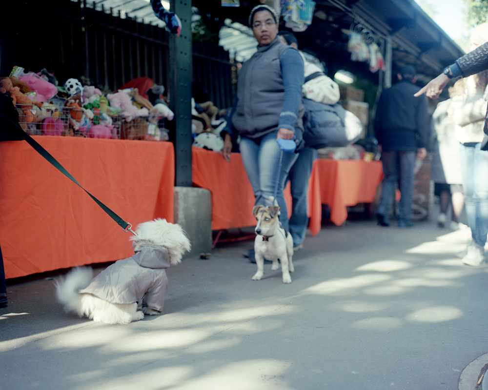 Here are the photos I mentioned a couple posts ago when talking about the Metro stop for Ile de la Cité. There’s a little open-air market they have set up right across from the exit where they sell pet supplies, flowers, and other various and sundry items. Here are two little dogs out for a walk in the pets section who were straining to take a look at one another.