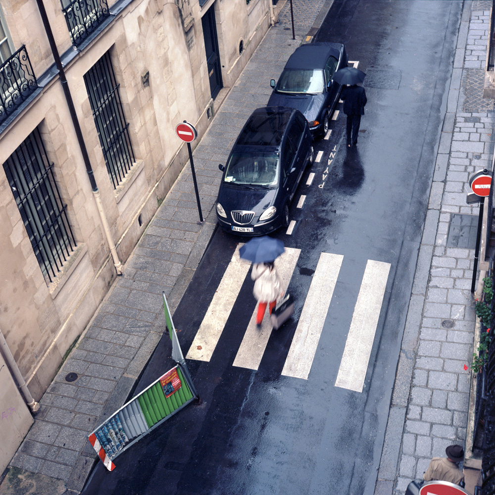 Even though it was raining, I stepped out on the balcony and looked down, to see this scene of the woman with red pants crossing the street: