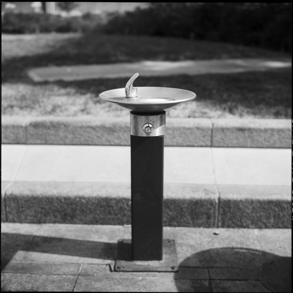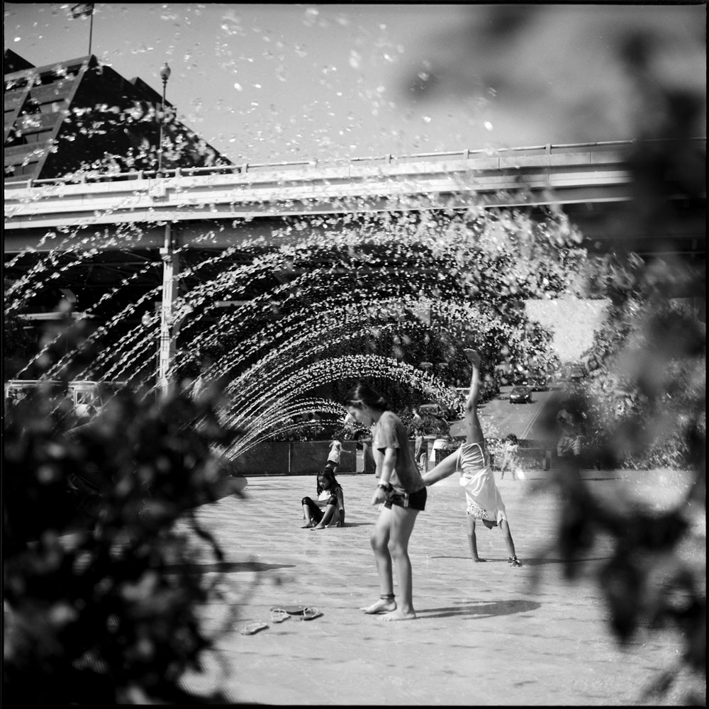 In the same park there is a large fountain just made for people (mostly kids, but I do see some young-at-heart adults occasionally venture into it too) to run under and get wet to relieve themselves from the heat of a scorching summer day. It’s almost as refreshing to watch them running in and out of the fountain as it is to do it yourself! (not that I’m going to do it while wearing a Rolleiflex around my neck)