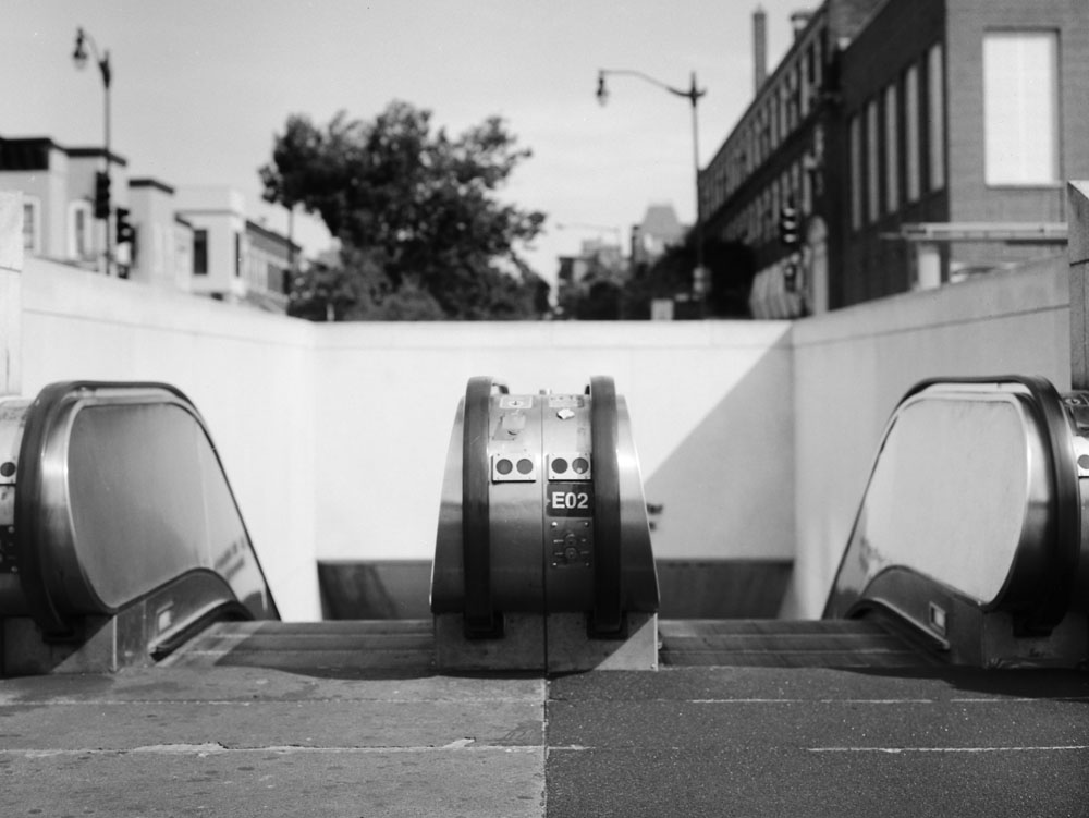 These first two images are of the Capitol Bikeshare rental rack near my house. I’ve photographed the Bikeshare racks before, with full racks of bikes, to capture the receding perspective of the bike wheels. This time, I shot the bike rack with only one bike in it, to work with the late afternoon shadows created by the rack itself, and also to demonstrate the popularity of the Bikeshare, at least in my neighborhood. As you can see, on a Sunday afternoon, with the heat rising to over 90 degrees F, all but one of the bikes from this rack are in use.