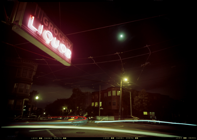 I just got home from a well-deserved, long overdue vacation to San Francisco. It’s one of my favorite cities on earth. I love the geography of the place, the architecture, and how they’ve managed to balance proximity of a highly developed urban environment to wide open natural environment. You get the best of both worlds there. Tonight’s posting will be a bit of a departure for me as I mostly shoot black and white. These are large-format color images, shot at night. One night I wandered around the neighborhood of my hotel, shooting whatever struck my fancy, and another I took a side-trip up to the Castro to shoot some street scenes. Here are some first scans of the images.