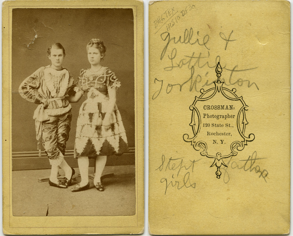 Here’s another circus performer pair – the hand-written label says “Gullie and Lottie Tarkinton”. I was unable to find any reference to who they were. They’re not listed on Olympians of the Sawdust Circle. I’m guessing they are sisters, perhaps even twins. The one is dressed and posed in a very masculine way, quite in contrast to the other, which is its own kind of interesting. And I’m a sucker for a photo that you can see the head clamp stands in.