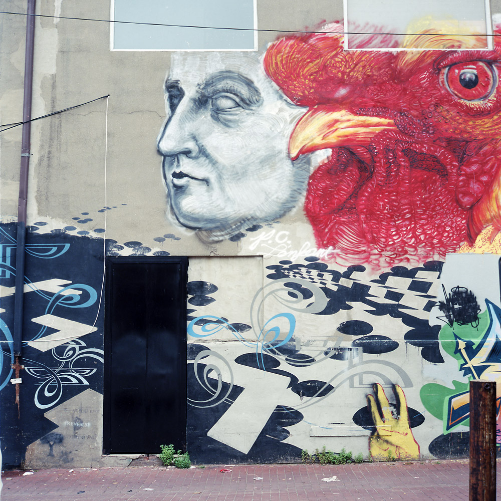 Another M.C. Escher-esque optical illusion in the mural- when you first look at it you see a redhead with long, flaming hair streaming behind. Then you realize it’s a head with a chicken next to it. But it’s hard to keep seeing the chicken, and easy to go back to seeing the redhead alone.