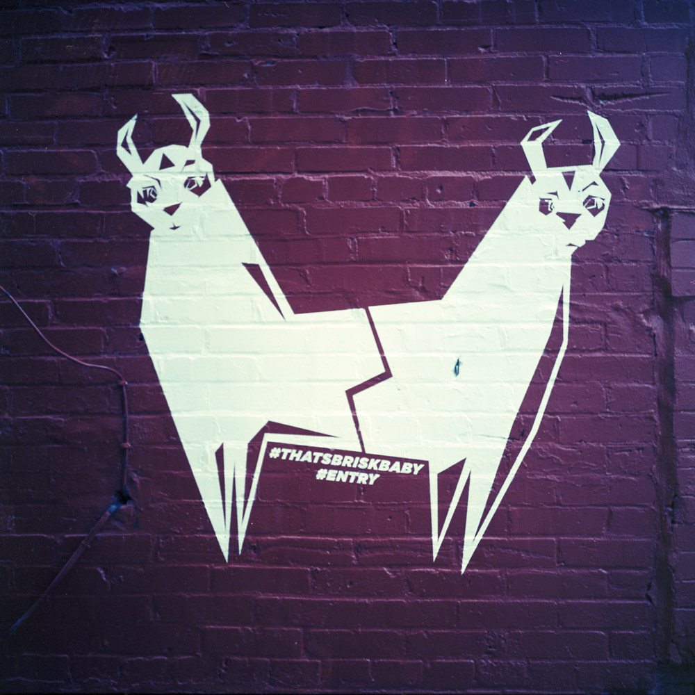 I forget exactly where the two-headed Llama is located, but it’s near the alley mural. Very different texture and style, obviously not the same artist (the Llamas are a stencil, whereas the mural is almost entirely freehand). But Llamas are always cute.