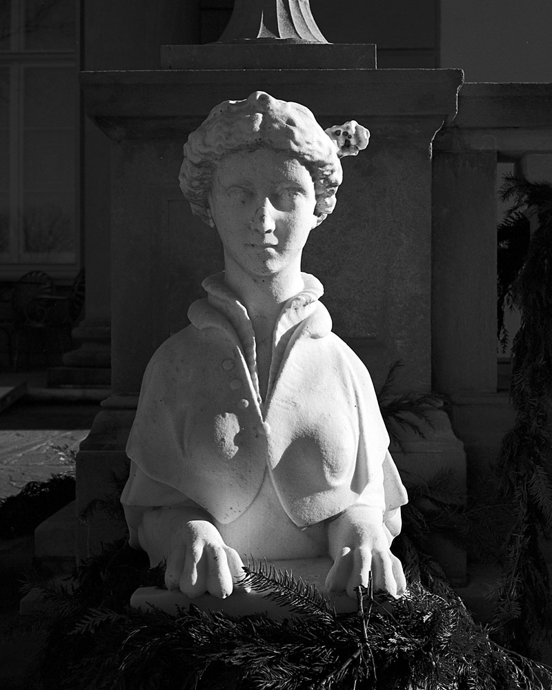 Here is a sphinx, one of a matched pair, guarding the front porch of the house. I loved the way her white marble glowed in the late afternoon winter sun.