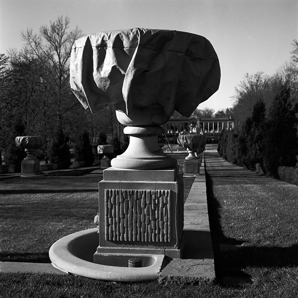 This is a view down the lawn from the mansion front, looking to the colonnade (which crowns a massive fountain on the other side). The garden urns have been prepared for winter with their canvas covers and their fountains drained. Even today, the estate totals some 300 acres, down from the original 3000.