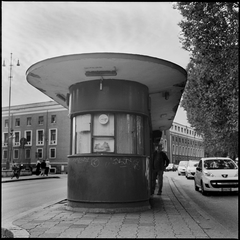 This is where I went to catch a bus to go to the Vatican Museum on my first day in Rome. It’s a vintage bus shelter, hard to date, but I’d guess post-war, maybe as late as 1950s. What you can’t see in the picture is that in the middle of the structure is a news-stand. Today it’s not so bad, but I wouldn’t want to have had to work there even as recently as the 1980s when diesel exhaust was much heavier than it is now.