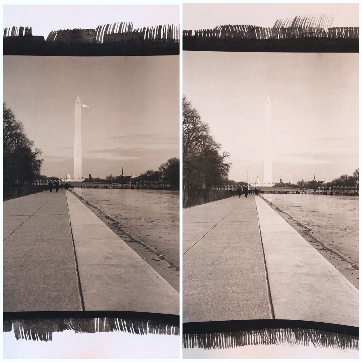 Both prints were made with 9 drops palladium/9 drops Ferric Oxalate, on Hahnemuhle Platinum Rag paper, exposed for 15 minutes. Image size is 8×10 inches. The print on the left had no NA2. The print on the right had 1 drop of 5% NA2 added. Obviously this is way too powerful. I’m going to re-print trying a 1% and a 2.5% concentration to see which gets me where I want (still retaining detail in the Washington Monument, but brighter highlights and more tonal separation in the trees on the left).