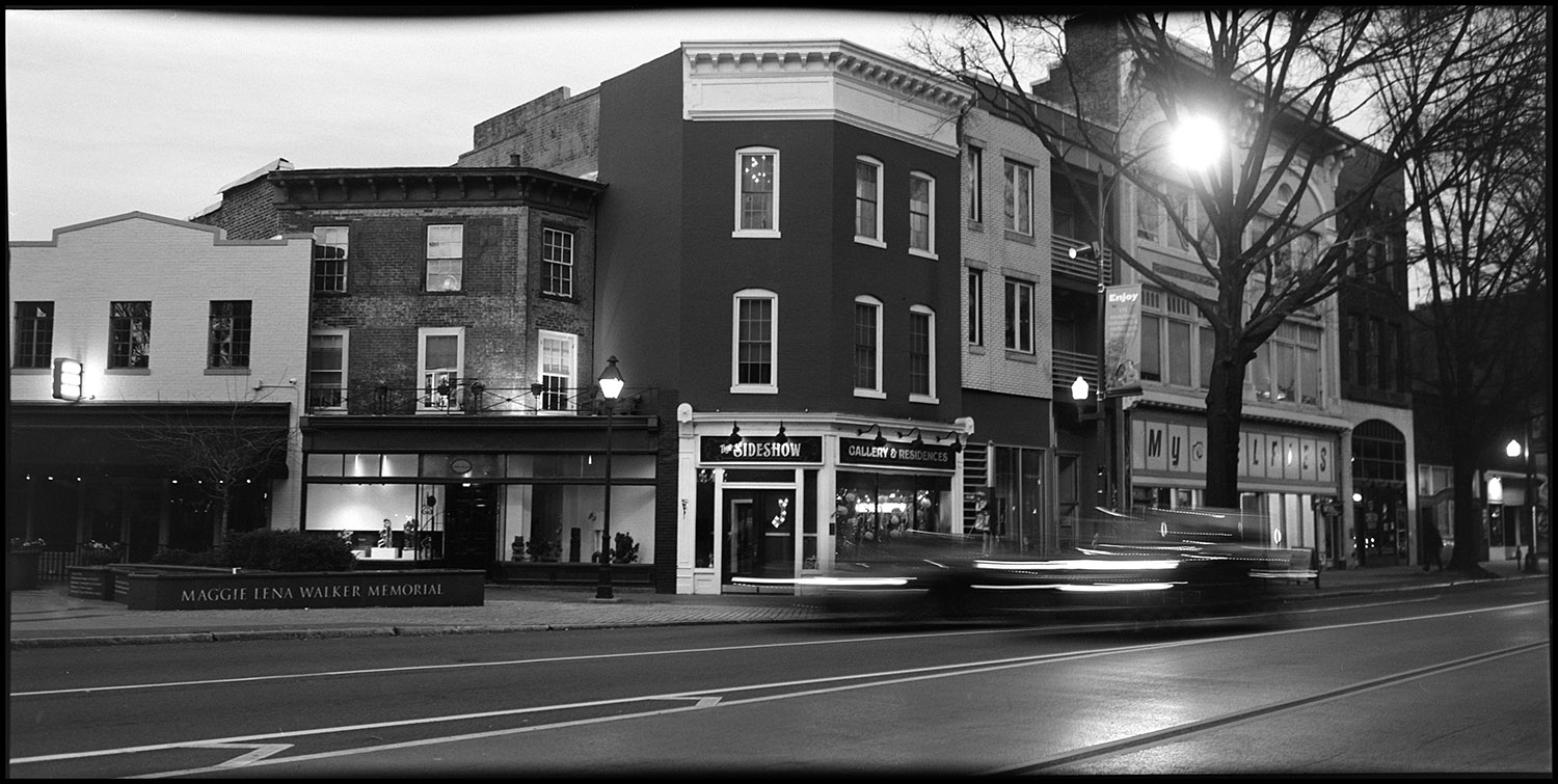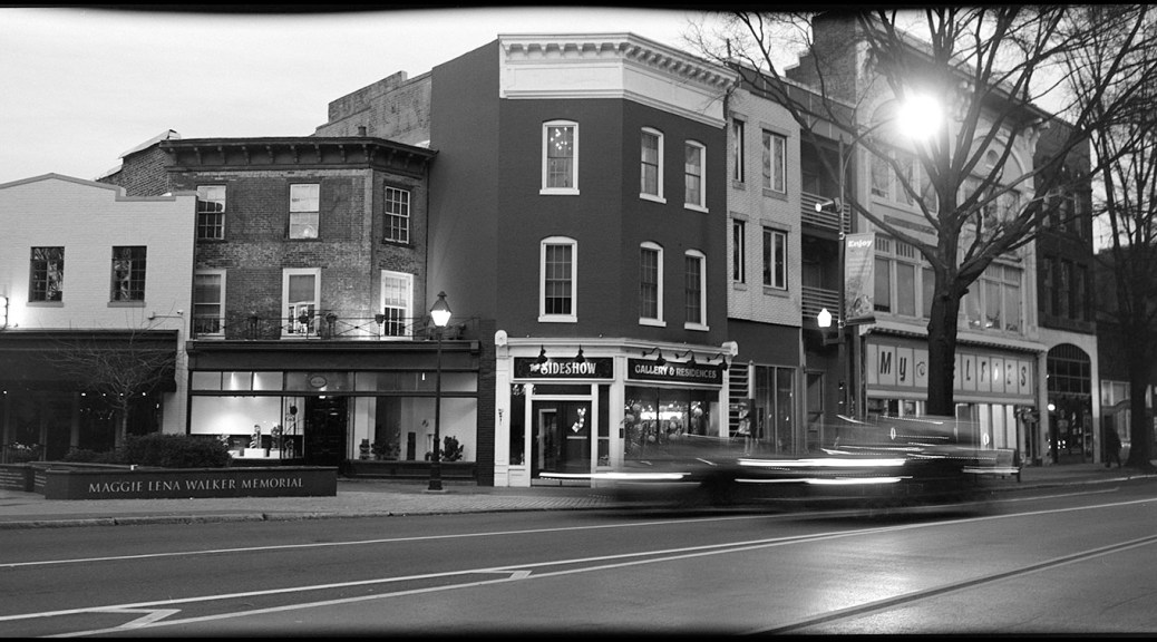 One evening I took the camera out and did some twilight shots – all hand-held, along Broad Street in downtown Richmond. The Lomo is very good for that kind of shooting, and I apparently have hands of steel when it comes to doing slow shutter speeds. The Lomo doesn’t tell you what speed it’s using, but some of these shots were anywhere between 1/15th and 1 second. I tried one or two that went past 1 second but I’m not THAT good.