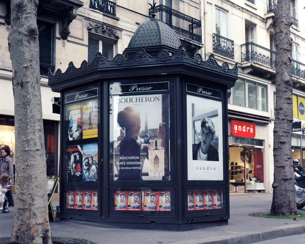 Newsstands fall into that category as well, I think, of things we see but ignore. They’re very functional, and in places that have them, we tend to notice their presence/absence more than we do their form. This one is very Parisian, but with a modern twist – instead of having static broadsides plastered to the outside, now the ads are LED displays or at least rotating banners so in the span of a minute, you can see three to five different ads scrolling past.