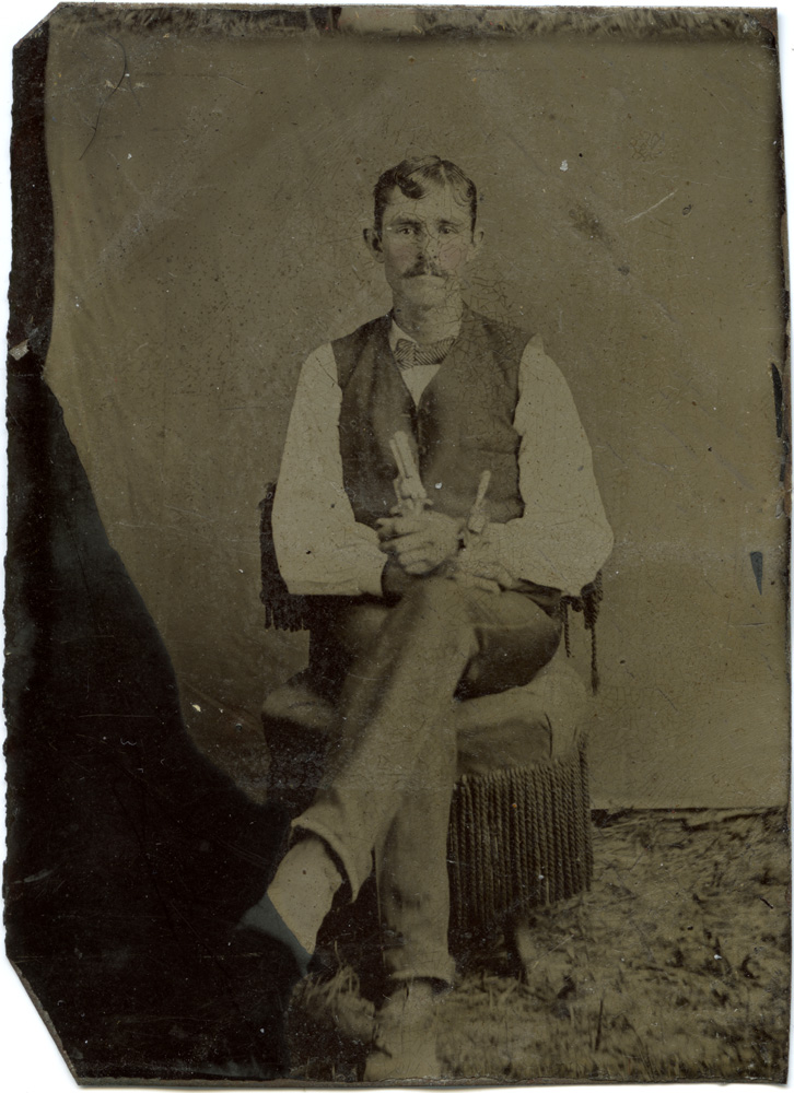 Here’s a little gem I recently uncovered. No date, no attribution, no name of the subject. It’s a little approximately 1/6 plate tintype. Definitely not from a professional studio, as the plate is ragged – the edges appear to have been almost torn from a bigger sheet, and the collodion pour and/or development are uneven. The photo was taken in the field (literally – you can see the grass under the sitter’s chair, and the backdrop looks like it might have been a rug or blanket with some kind of fringe on top, thrown over a hastily erected backdrop stand). Still, the photographer went to the effort to tint the cheeks on the sitter. It brings to mind the civil war soldier portraits with the young men about to march off to war posing with pistols. I wonder, like with those war portraits, if the pistols are indeed property of the subject or if they are merely props he chose to pose with because they looked cool (many of the civil war soldier photos are using prop weapons that belonged to the studios. Many soldiers had not yet been issued firearms when they had their pictures taken, and they often posed with weapons inappropriate to their rank and status – enlisted men with non-government issue pistols, for example). Was he a saloon keeper? A lawman? The guns are kind of dinky, and he’s handling them rather casually. I think it’s the aura of uncertainty that lingers with an image like this that makes it so fascinating.